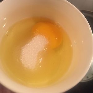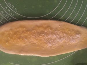 椰蓉馅料制作:鸡蛋打散加入白糖搅拌均匀。然后用擀面杖把面团擀成椭圆形,再刷上调好的蛋液。
