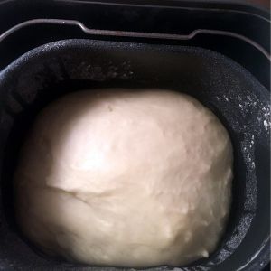 除黄油外,面包桶内,按菜单排列的先后顺序,先放牛奶,奶粉,糖放面包桶的三个角落,盐放另一角,倒入高筋面粉轻轻震平面粉,中间挖个小坑放入酵母粉,然后启动快速和面两次,30分钟。