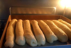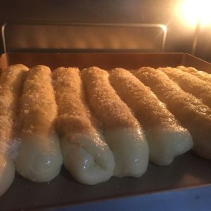 放入烤盘内进行第二次发酵。烤箱有发酵功能哦,十分方便,发酵至原来的1.5倍即可!