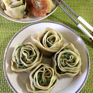饺子皮卷起来,用牙签固定最好的尾巴。饺子皮版忘记拍照了,附上馄饨皮版的照片。如果用馄饨皮,最好是大馄饨皮,小馄饨皮太薄了,煎煮的时候容易破。