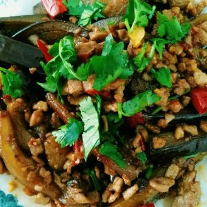 把炒好备着的茄子和肉再一起炒 放入葱段 再浇酱汁 翻炒收锅 放上葱丁或香菜点缀