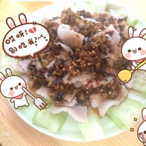 锅里放入冷水,4小粒大蒜,生姜,料酒,冷水放肉,加一小勺盐,大火煮开,转中火煮到肉熟透。我因为用的是切好的五花肉片,所以就煮了五分钟就好了,如果用的是大块的五花肉,就要多煮一段时间哦,判断的标准就是用筷子戳进肉里不会带出血水,那么再煮个两分钟就肯定熟了