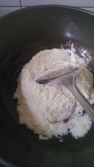 棉花糖完全融化了之后加入奶粉并搅拌均匀