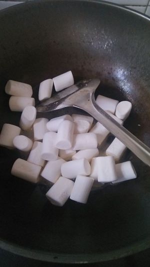 黄油全融化了之后加入棉花糖,小火勤搅拌