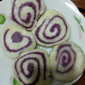 紫薯蒸熟碾碎,加入面粉,牛奶酵母