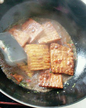 先将姜葱蒜放油锅,等飘出香味后,放入豆腐干,随后将酱汁倒入,翻炒,大火收汁即可出锅。