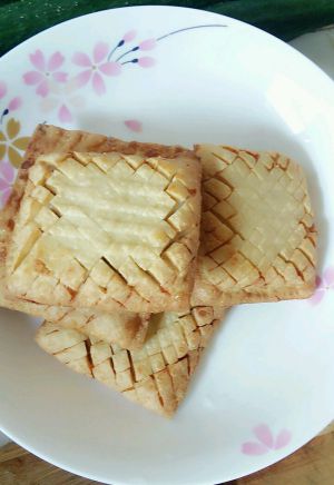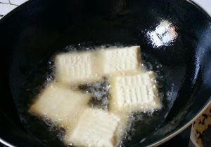 油锅起热,放入豆腐干,炸致两面金黄,捞出备用。