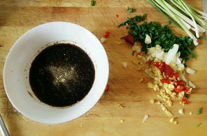两勺酱油,两勺醋,适量盐,糖,撒点花椒粉,胡椒粉调匀。