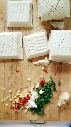 将蒜姜葱切丁,尖头椒切小段,豆腐干切田字格。