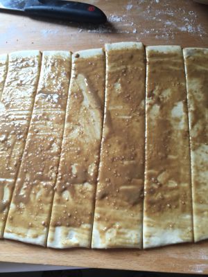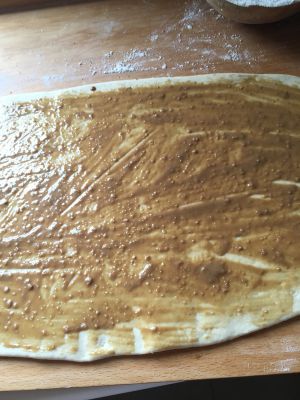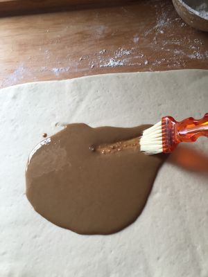 面皮上倒上调好的芝麻酱,用刷子刷开