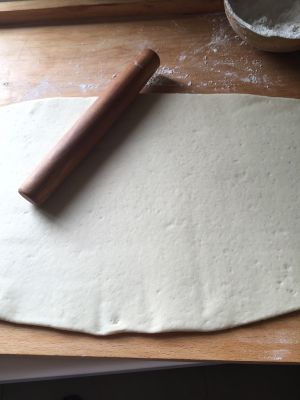 牛奶微波炉加热一下,用来化开酵母和白糖,倒入面粉中和成面团。(我用的是全麦面粉,所以没有那么白)