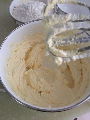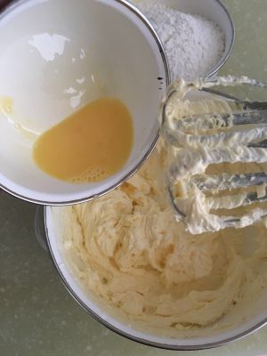 黄油室温软化后,分三次加入细砂糖打发,至颜色变淡,体积膨胀。