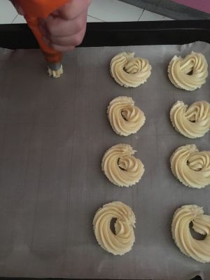 装入裱花袋,在铺好油布的烤盘内挤好花,同时烤箱预热170度。