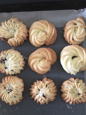 烤至上色稍凉出锅即可。这次把剩下的第二盘加了蔓越梅干,因为切的不够细,不得不换了个大一号的裱花头,出来的效果如图。