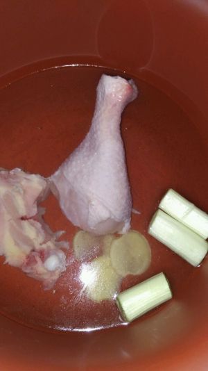 葱段,姜,鸡腿,放入砂锅中