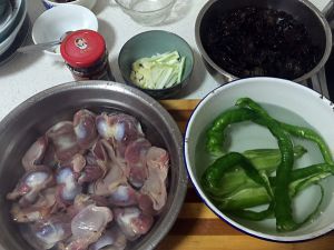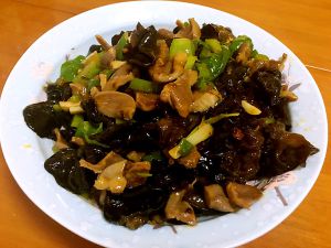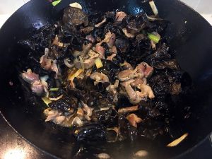 锅热油 下葱姜蒜 一勺老干妈辣酱 爆炒木耳 再加入鸡胗 大火翻炒一分钟