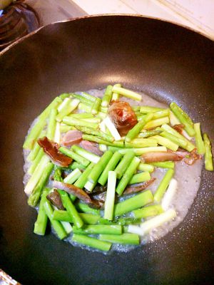 扔进芦笋翻炒,加一小点水,大火炒到水干,就可以倒出了