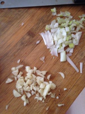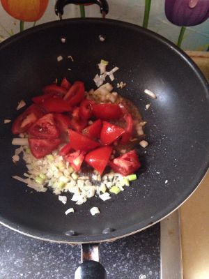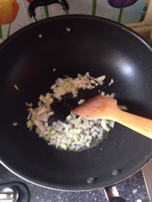 倒入油,稍微少一点,因为茄子里有很多油后。油热后将葱和蒜放入翻炒。