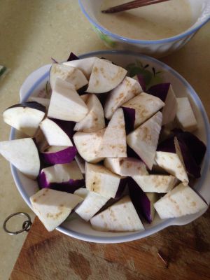 把茄子切成这样的块,建议用长茄子,比较嫩。