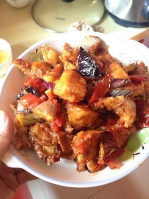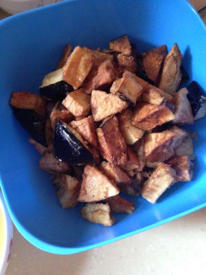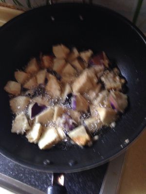 之后把茄子倒进去,翻炒,加盐,糖,生抽。