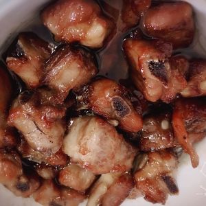 第三步,下油,把冰糖放下,至溶解,變黃色,然後把剛剛出鍋的排骨放下去炒,炒至差不多,加調味料,即可。