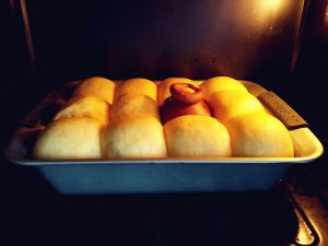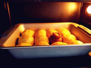发酵到两倍大小后,入预热好的烤箱中层,上下火135度烤15分钟左右