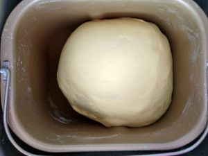 将牛奶、淡奶油、酵母粉、高筋粉、糖、盐、全蛋液、玉米油依次倒入面包桶内,启动甜面包程序,进行和面