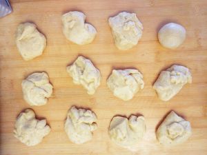 将薄片环起,包住圆球,做成蜂蜜罐的样子。其他面团揉成球,放入模具中
