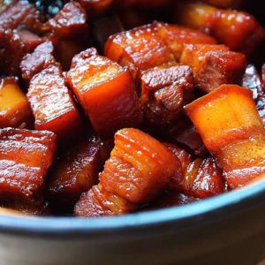 再次把肉捞起,放入冰糖炒至金黄色后加入水、料酒、八角、干辣椒、香叶、陈醋、老抽、生抽,等水沸了再倒入五花肉、大火煮五分钟,再转小火炖45分钟,最后收汁。