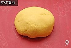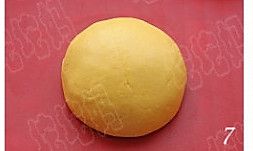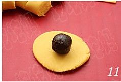 取一个小剂子,搓圆擀平,放入30克豆沙馅;
