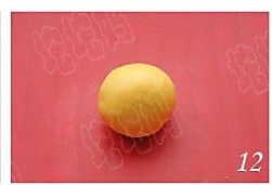 将小球按入月饼模中,压平推出,即成月饼生坯;