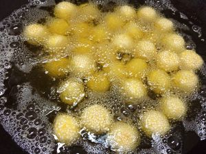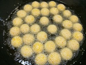 锅中倒入油烧至五成热,放入南瓜球,小火慢炸