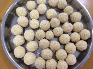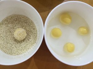 准备一碗清水和一碗白芝麻,南瓜球在水中滚一圈,湿润表面,再在白芝麻中滚一圈,让南瓜球上沾满白芝麻,用手稍稍握紧,让白芝麻沾的更稳一些