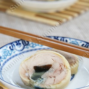 轻轻抖落鸡腿肉上的姜末,皮向下平铺到保鲜膜上,中间摆上一条切好的松花蛋;