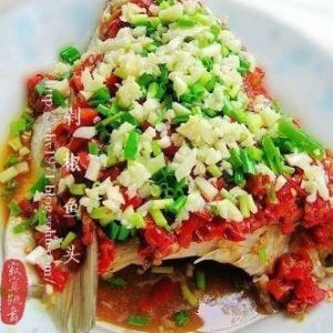将蒸好鱼头取出,倒掉多余的蒸水,表面撒上蒜茸,葱花