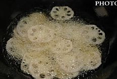 锅中放入油,油温6成热时,放入藕片炸至表面微焦后,捞出沥油。