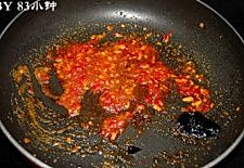 锅中留少许底油,放入葱姜末炒香,倒入豆瓣酱炒至出红油,加入甜面酱炒匀。