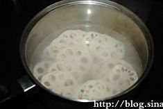 烧一锅开水,放入藕片氽烫2分钟左右,捞出沥干水分,撒上生粉拌匀。