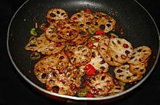 倒入藕片,加青椒,料酒,生抽,白砂糖略炒,起锅即可