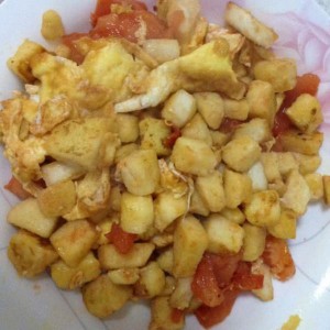 加入炒好的馒头丁,翻炒一会加盐,出锅
