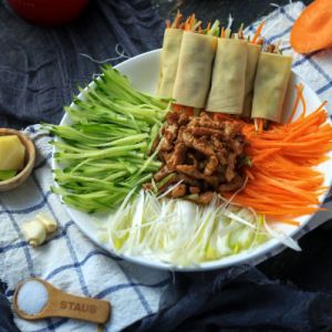大葱、胡萝卜、黄瓜洗净切成细丝备用,薄百叶在热水中浸泡10分钟,然后切成巴掌大小的方形,并将它们整齐的码放在盘子上;