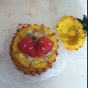 第三步:装饰步骤。将饭盛入菠萝桶内,一颗草莓洗净去叶切半呈桃心状,用牙签挑几粒米饭嵌进草莓果肉面部做成笑脸,然后盖上盖子上桌 一道可口美观有爱的菠萝饭完成了!