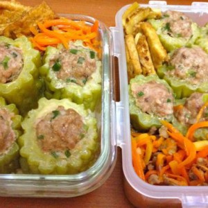 苦瓜洗净切5cm左右的小段;肉馅中加入切好的小葱段、盐、酱油、色拉油、香油,并搅拌均匀