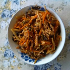 3. 热油倒肉丝炒白,盛出。热油倒胡罗卜丝炒好盛出,热油葱姜蒜炒香倒木耳笋丝翻炒,将肉丝胡罗卜丝倒入翻炒,配好的料水倒入,最后调三茶匙生粉五茶水