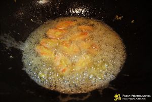 锅烧干水放入一碗半左右油,大火烧起泡泡转中小火,把虾放入油中炸,尽量避免把蛋液也带到油里。