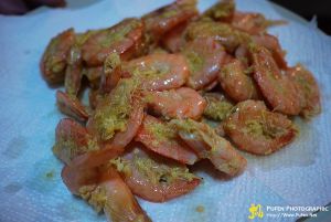 将腌好的虾用筛子沥干水,并大概去掉姜蒜蓉等,用全蛋液包裹上。
