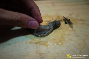 虾洗净,从眼后方竖刀切去头刺;横刀开虾背,并取出虾肠。