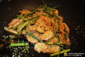 倒入虾翻炒与面包糠 拌匀,这时可以撒入少许的香茅粉提重一下味道。起锅装盘。这道菜闻起来十分香,吃起来,更香。