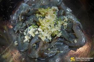 把姜蒜蓉、料酒、少量盐放下虾中拌匀腌制十五分钟。