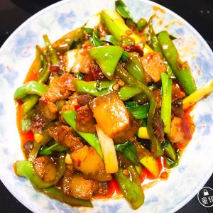加入青蒜,生姜,大蒜,青椒条一起大火爆炒几下,青蒜断生就可以。关火时加点白糖炒两下,出锅。